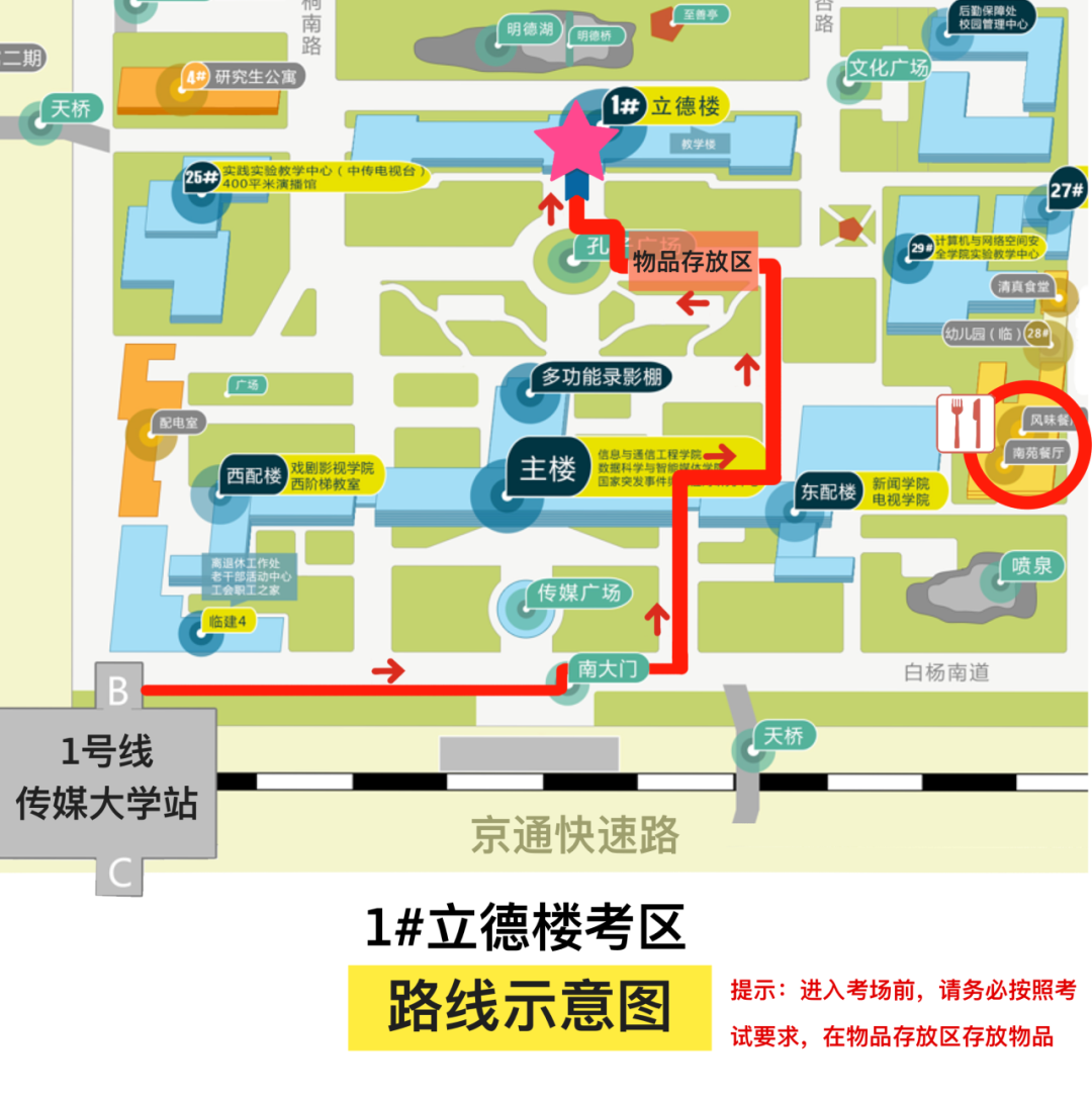 考试当日,考生可从学校南门和北门入校,早晨6:30即可开始入校。校门入口处将设置本校考生通道和社会考生通道,本校考生通过闸机刷脸入校,社会考生须查验本人准考证和有效居民身份证,并经人脸识别设备刷脸通过后方可正常入校。考生进入校园后,请按如下路线图和指示标志直接前往所在考区考场,不可在其他区域活动或逗留。